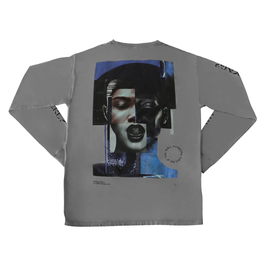 The Shinedown 'Gray Long Sleeve T-Shirt' features a black Shinedown SD circle logo on the front of the shirt and a collage of a face on the back. The sleeves feature lyrics in black. This design is printed on a gray unisex long sleeve t-shirt.